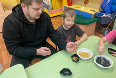 Сначала родители рассказали детям о птицах, используя интерактивные карточки, включающие в себя, помимо описания птицы, ещё куар-код с голосом этой птицы. Дети слушали голоса птиц, а потом вместе с мамами и папами, под руководством воспитателей сделали экокормушки.